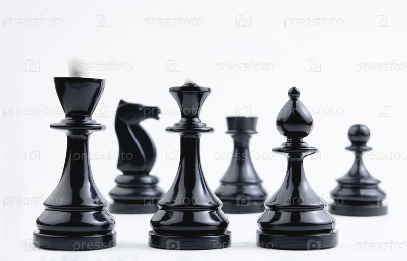 Шахматные фигуры на белом фоне. Настольная логическая антагонистическая игра. Интеллектуальный спорт