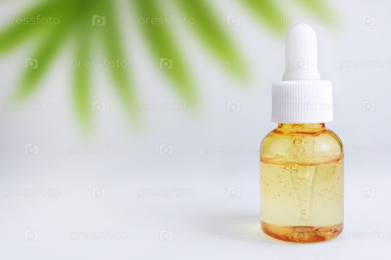 Макет стеклянной бутылки-капельницы. Прозрачный контейнер оранжевого цвета с маслом для лица, лосьоном или сывороткой. Косметология и концепция красоты, гомеопатия и альтернативная медицина
