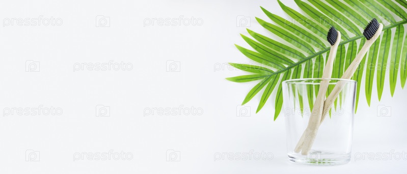 Бамбуковые зубные щетки в стакане на фоне пальмового листа, на белом фоне. Концепция личной гигиены, стоматология, ноль отходов, экологичность. Баннер. Копировать пространство