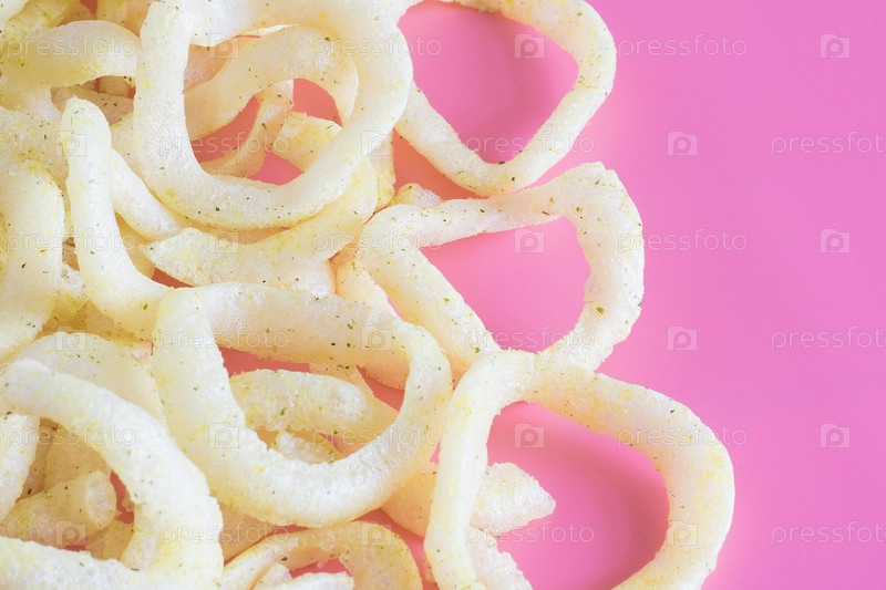 Куча хрустящих луковых колец крупным планом на розовом фоне. Закуска луковыми кольцами