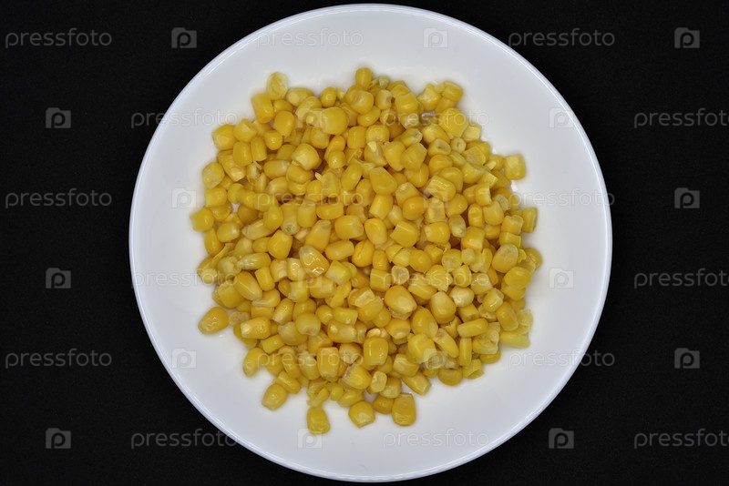 Свежая консервированная кукуруза на белой тарелке. Кукурузный салат. Желтые кукурузные зерна