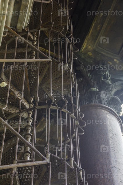 Колоннада Исаакиевского собора в Санкт-Петербурге, Россия, металлическая лестница и часть капители колонны (коринфской)