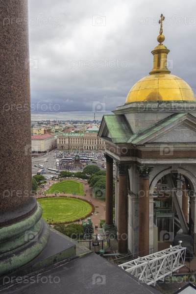 Санкт-Петербург, Россия, 8 июля 2016 г. Вид с колоннады Исаакиевского собора, Исаакиевской площади и памятника