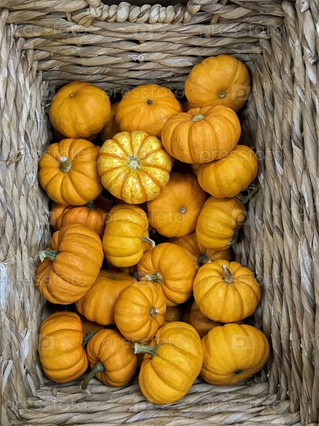Свежие спелые сырые маленькие тыквы в декоративной корзине на рыночном прилавке. Вид сверху. Можно использовать как фон