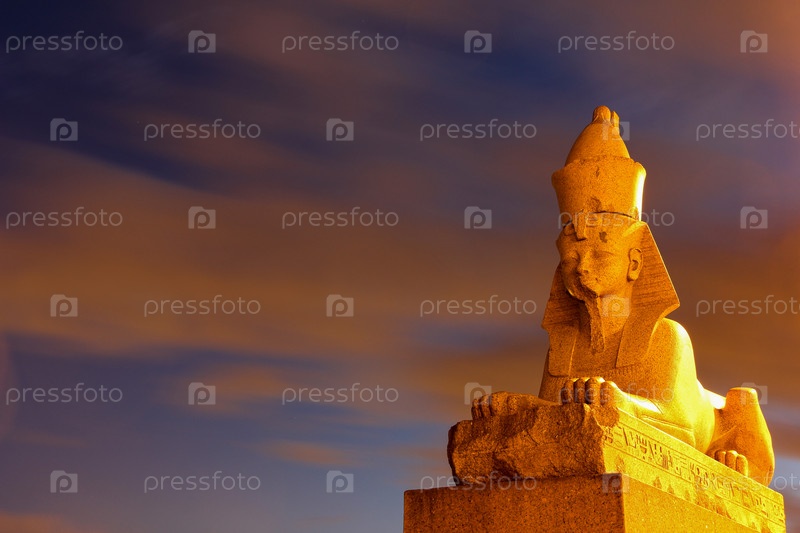 Сфинкс в Санкт-Петербурге на набережной реки Невы перед Академией художеств и Благовещенским мостом на фоне ночью