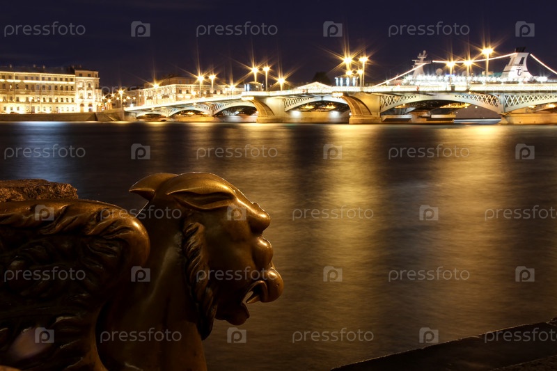Грифон в Санкт-Петербурге на набережной реки Невы перед Академией художеств и Благовещенским мостом на фоне ночью
