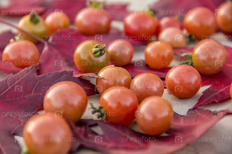 Свежие красные спелые осенние помидоры черри, лежащие на красных кленовых листьях на фоне старого цементного стола