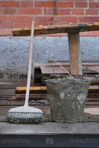 Ведро и стальная щетка для работы с цементом на фоне фасада дома