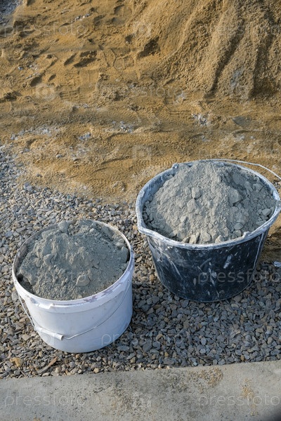 Цемент в ведрах на фоне кучи песка и щебня