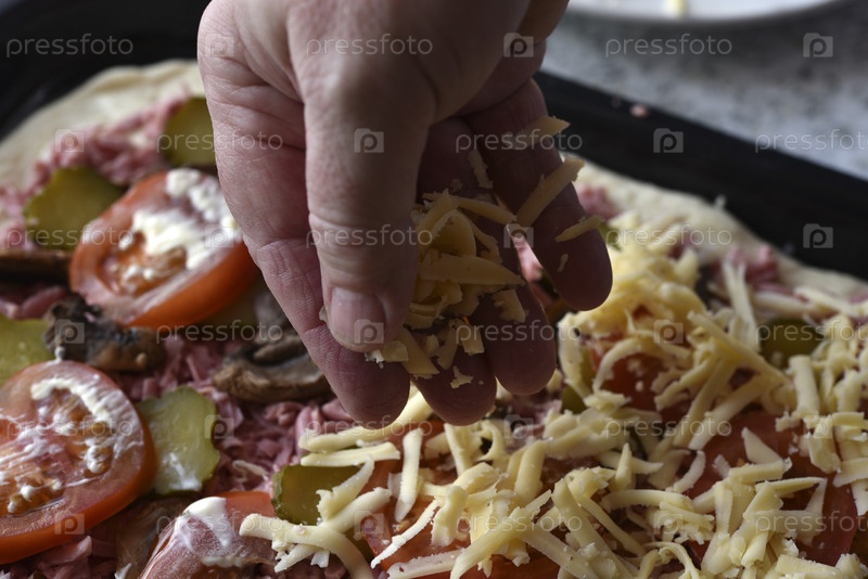 Приготовление свежей пиццы. Посыпать сыром пиццу. Рука повара посыпает сыром пиццу