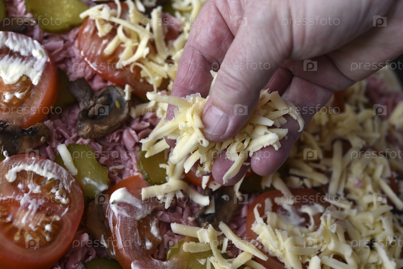 Приготовление свежей пиццы. Посыпать сыром пиццу. Рука повара посыпает сыром пиццу