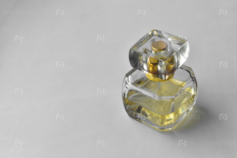 Желтый флакон духов на белом фоне