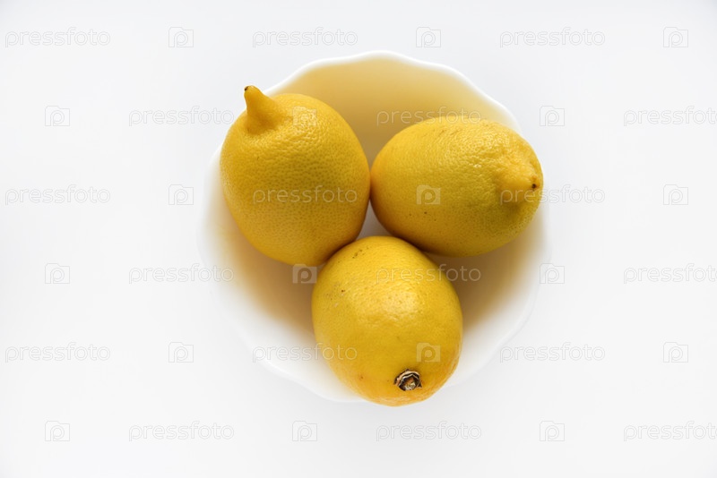 Желтые сочные лимоны в белом блюдце. Вкусные желтые лимоны на белом фоне. Красивые лимоны на тарелке