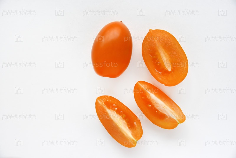 Целые и нарезанные желтые помидоры на белом фоне. Вкусные и сочные желтые помидоры. Плоды томатов в группе крупным планом