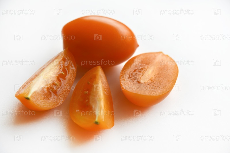 Целые и нарезанные желтые помидоры на белом фоне. Вкусные и сочные желтые помидоры. Плоды томатов в группе крупным планом
