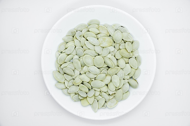 Белые тыквенные семечки на белой тарелке. Семена тыквы на белом фоне