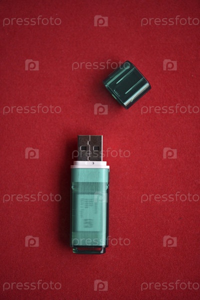 USB флеш-накопитель в крупном плане на красном фоне. одна флешка с крышкой