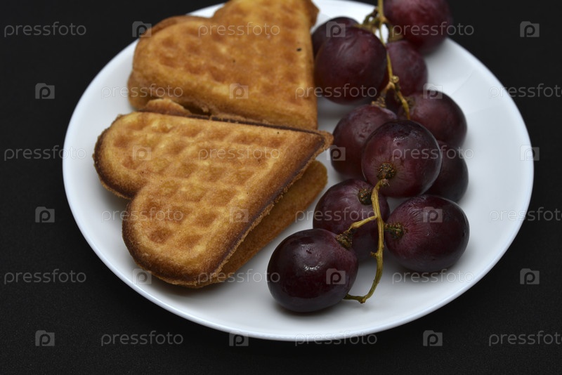 Вкусные вафли и виноград на тарелке. Сладкий завтрак из вафель и красного винограда. Вафли в форме сердца