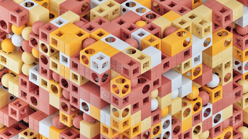 Изометрический вид куба из геометрических фигур. Оранжевый, желтый и белый цвета. Абстрактная трехмерная композиция. Шаблон для фона или дизайна обоев. 3d визуализация