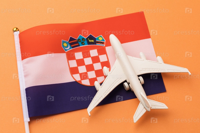 Хорватский флаг и игрушечный самолет на цветном фоне, концепция на тему путешествия в Хорватию