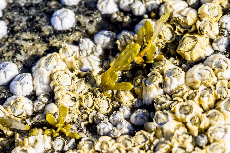 Морские моллюски Semibalanus balanoides на берегу Белого моря во время отлива. вид на известняковые домики ракообразных сверху