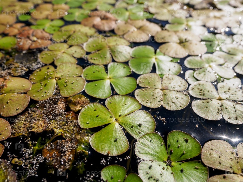 Выборочный фокус, крупный план мух, сидящих на личинке (Lemnoideae) в пруду в солнечный день