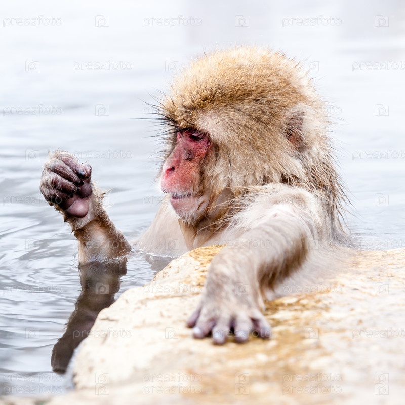 Забавная японская снежная обезьяна смотрит на лапу в горячем источнике. Префектура Нагано, Япония