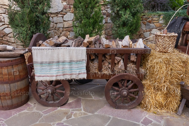 Деревенская телега, полная дров. Рядом стоит старая деревянная бочка, связки соломы. Сзади есть ель и каменная стена