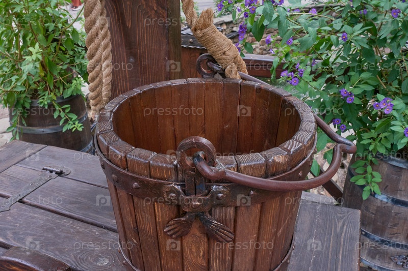 Деревянное ведро на веревке. Ведро в кованой раме стоит на вершине колодца в саду