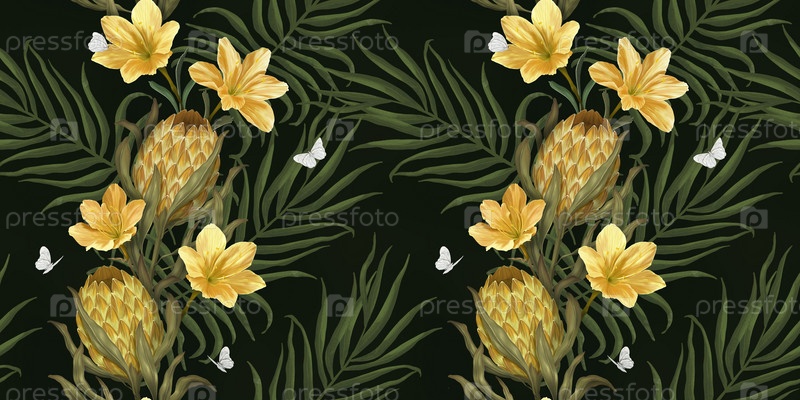 Экзотический тропический рисунок. Тропические цветы и листья на фоне. Протея, лилии, бабочки, пальмовые листья. Ручное изображение 3d иллюстрации. Темные тропические листья обои