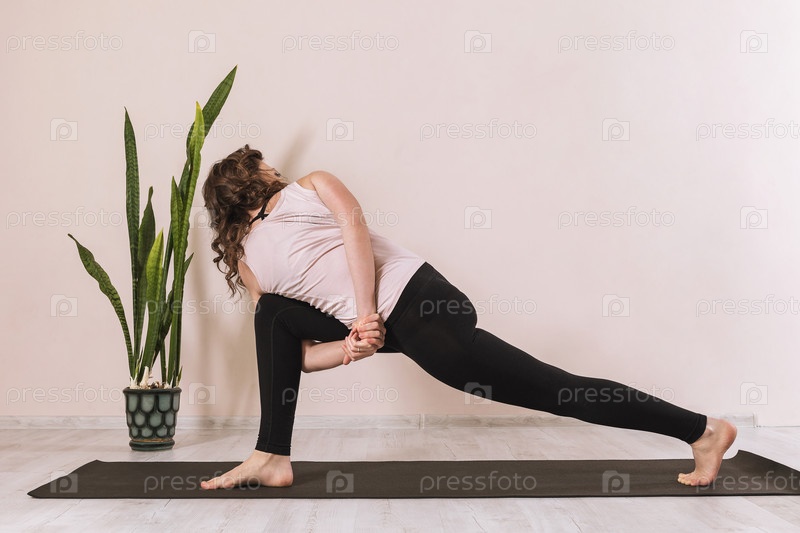 Женщина в спортивной одежде занимается йогой, делает паривритта паршваконасану, позу с обратным углом, занимается в студии у стены на коврике