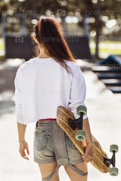 Девушка катается на длинной доске в скейт-парке