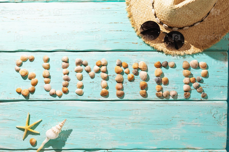 Слово лето, состоящее из ракушек на бирюзовом деревянном фоне, вид сверху