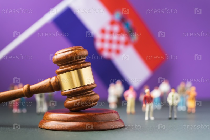 Судья молоток на фоне размытого хорватского флага и пластиковых игрушечных человечков, концепция судебного разбирательства в хорватском обществе