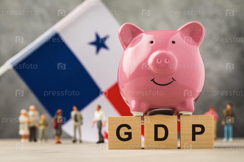 Копилка, деревянные кубики с текстом, игрушечные человечки из пластика и флаг на абстрактном фоне, концепция на тему ВВП в Панаме
