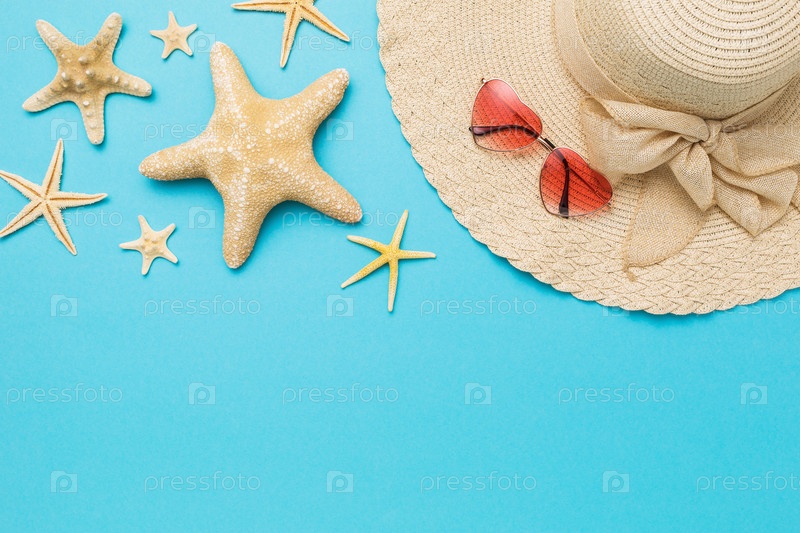 Различные морские звезды, шляпа и солнцезащитные очки на синем фоне с копией пространства