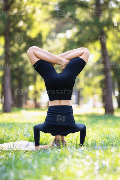 Женщина в черной спортивной одежде занимается йогой, выполняет различные упражнения ширшасаны, стойку на голове с лотосом, тренируется в парке теплым летним утром