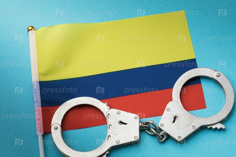 Колумбийский флаг и наручники на синем фоне, концепция на тему преступности в Колумбии, вид сверху