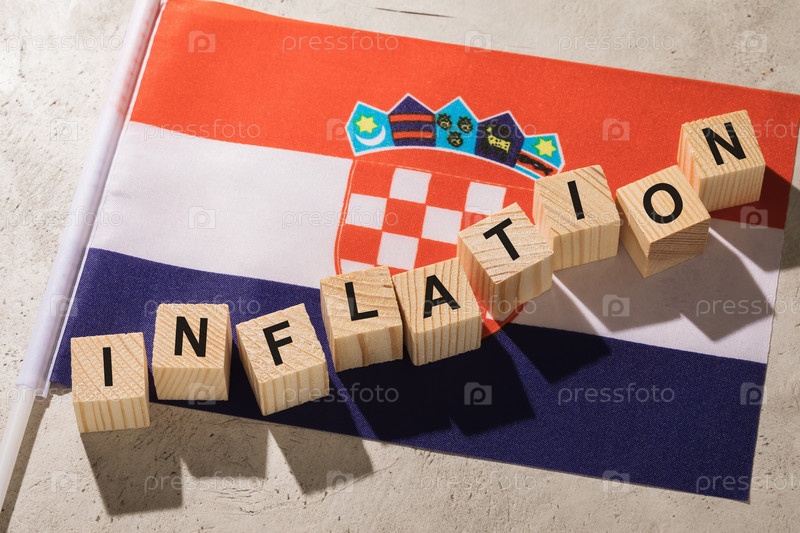 Флаг Хорватии и деревянные кубики с текстом, концепция на тему инфляции в Хорватии