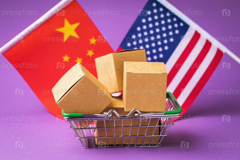 Различные коробки в продовольственной корзине и флаги Китая и Америки на цветном фоне, концепция торговли между странами