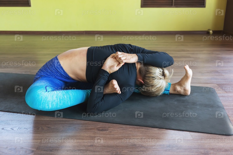 Женщина делает упражнение йогадандасана с руками хомухасана, поза посоха, тренируется на коврике в студии