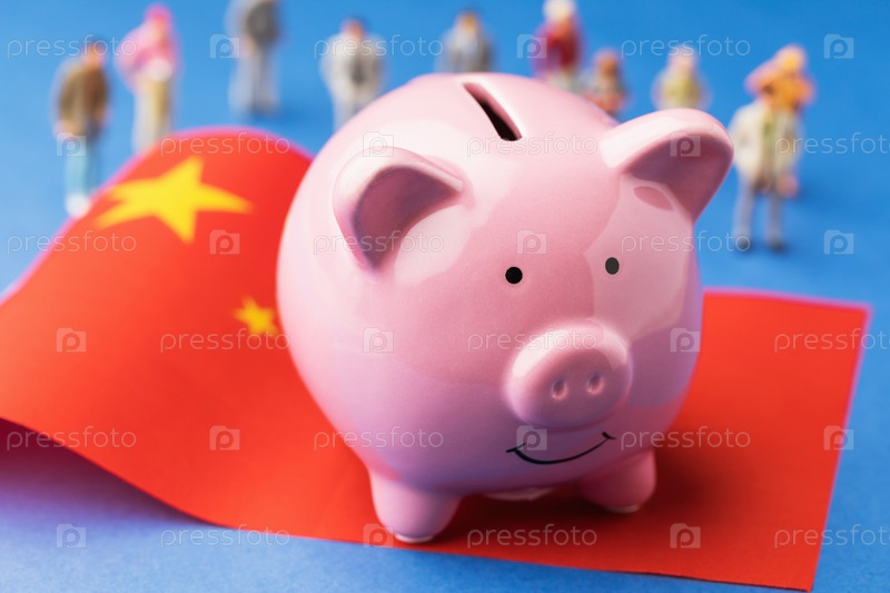 Копилка, китайский флаг и пластиковые игрушки на цветном фоне, концепция дохода в Китае