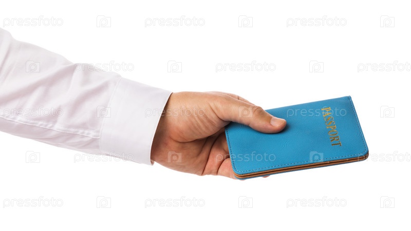 Мужская рука держит паспорт на белом фоне, шаблон для дизайнеров