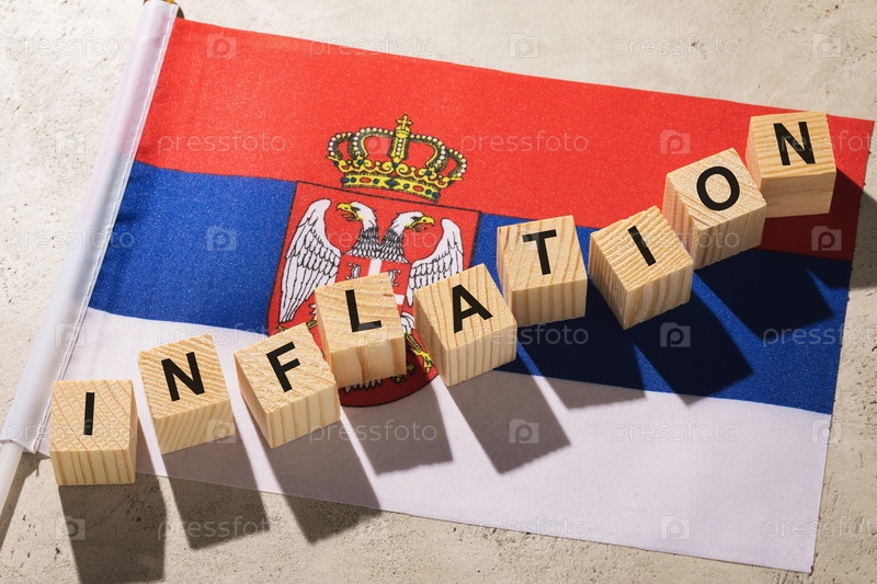 Флаг Сербии и деревянные кубики с текстом, концепция на тему инфляции в стране