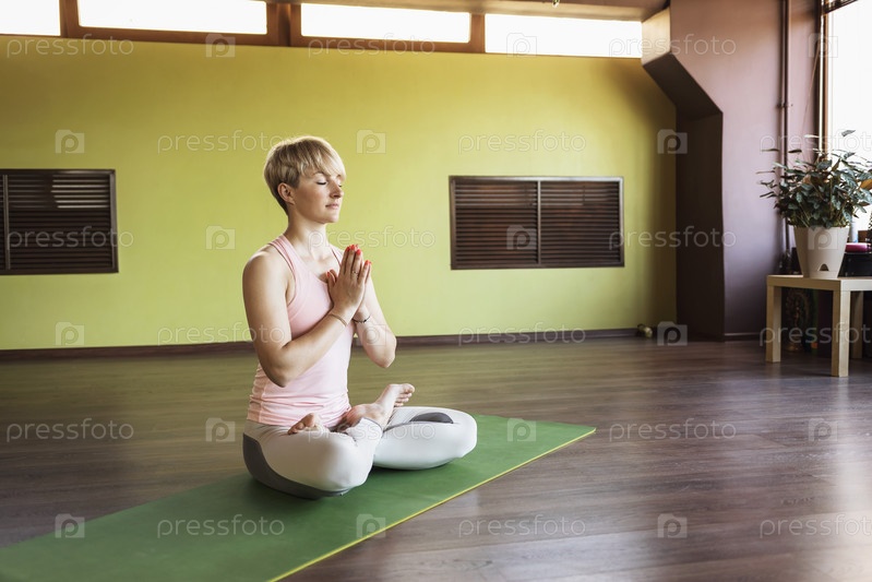 Женщина занимается медитацией в позе лотоса с намасте, сидящим на коврике в студии