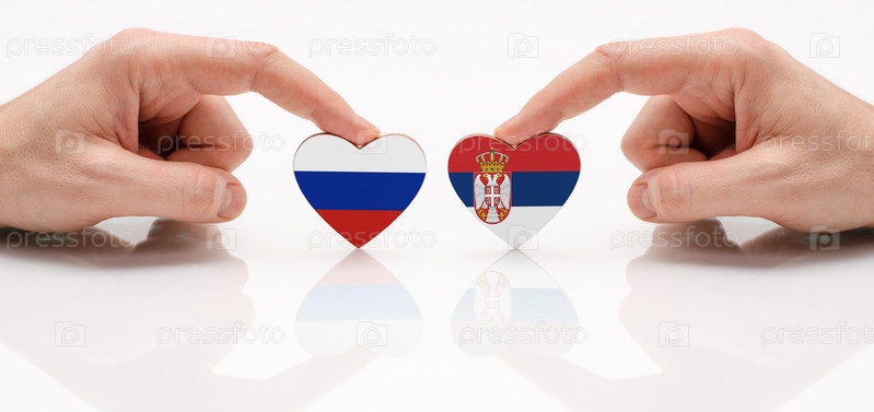 Концепция дружбы и дипломатических отношений между Россией и Сербией. Флаги России и Сербии в форме сердца в руках