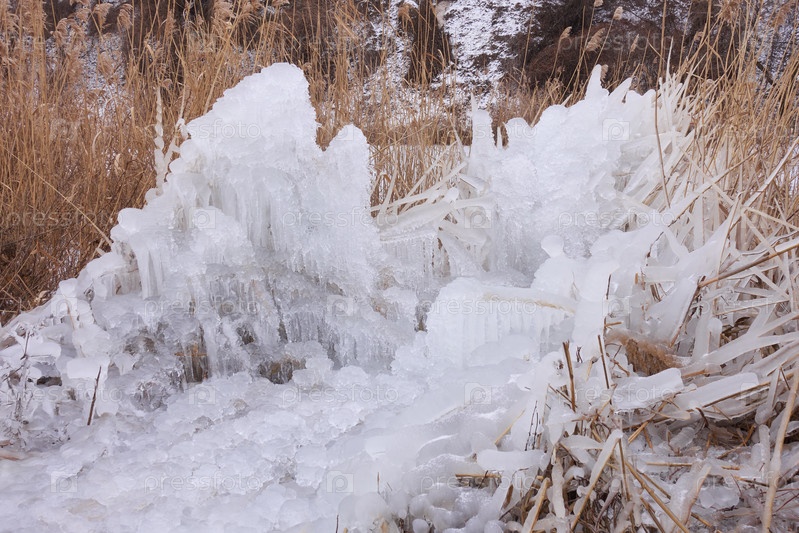 Замерзшая вода на тростниковых ветвях. Брызги воды из прорванной водопроводной трубы, падающие и замерзающие на растениях вокруг