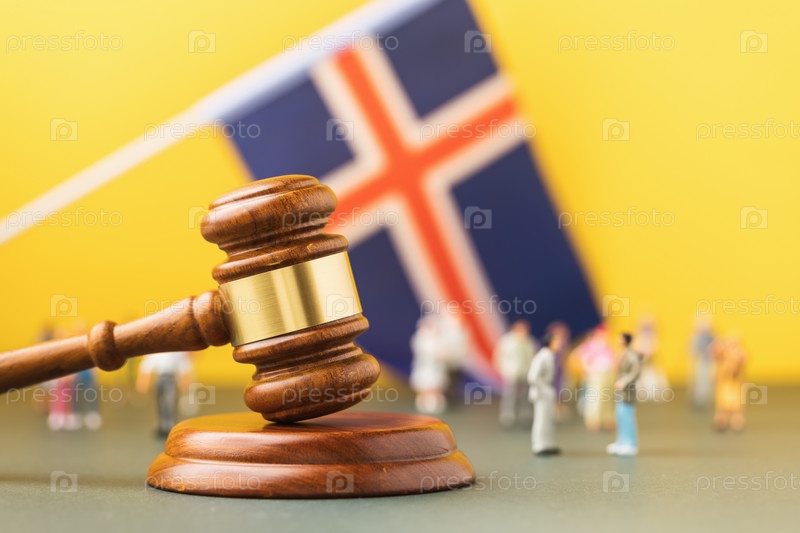 Молоток судьи, исландский флаг и пластиковые игрушечные человечки на цветном фоне, концепция судебного разбирательства в исландском обществе