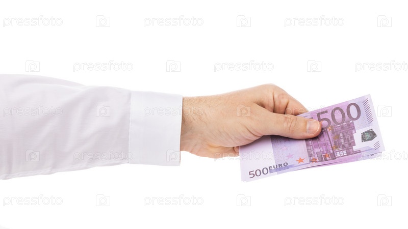 Рука человека дает пятьсот евро, изолированные на белом фоне