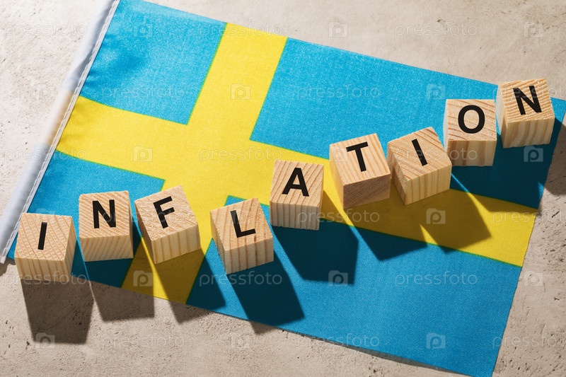 Флаг Швеции и деревянные кубики с текстом, концепция на тему инфляции в стране